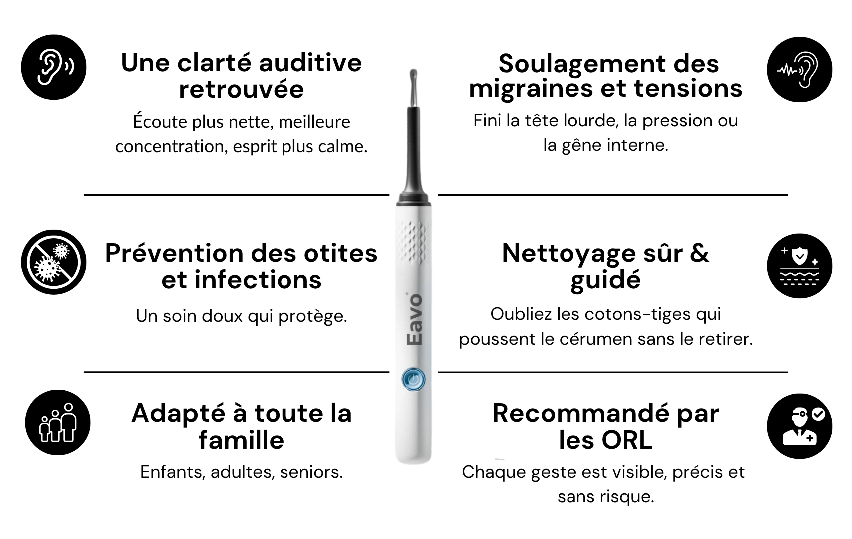 Contrairement aux cotons-tiges qui poussent le cérumen au fond, Eavo® Pro le retire en douceur, selon les recommandations ORL.