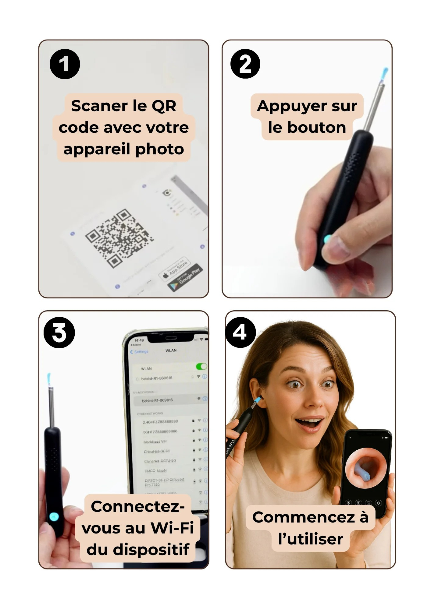 L’application dédiée vous montre en direct l’intérieur de l’oreille — pour un nettoyage précis, visible et sans risque.